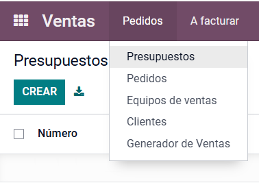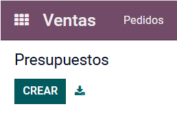 Al iniciar Odoo, se ingresa al módulo de Ventas. En el menú superior de pedidos, se da clic en Presupuestos.