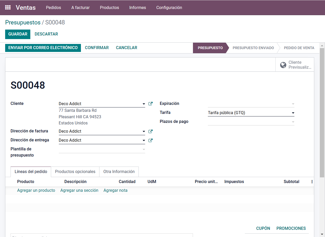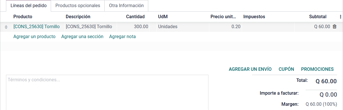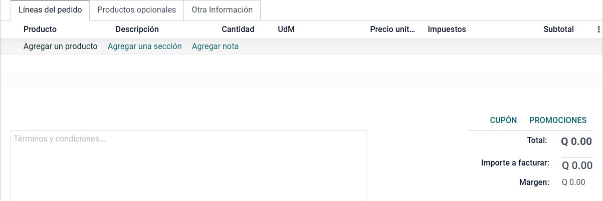 En la sección de Línea de pedido, se agregan los productos o servicios que se desea ofrecer al cliente.
