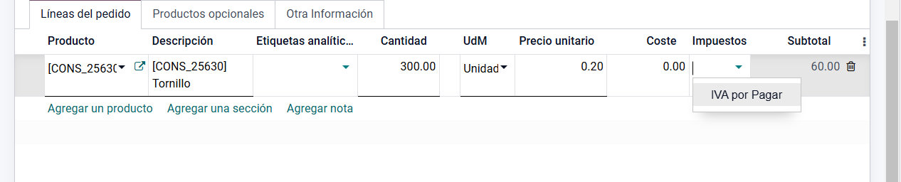 En caso de agregar un impuesto, podemos hacerlo en cada línea del pedido en el campo impuesto. Es posible agregar un impuesto nuevo o bien, de estar configurado el módulo, opciones para agregar como se muestra a continuación: