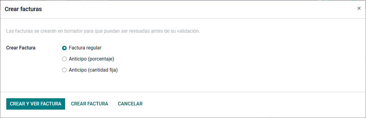 Existe también la posibilidad de crear la factura al momento de confirmar el inventario. La factura puede realizar a una factura regular o un anticipo por porcentaje/cantidad fija.