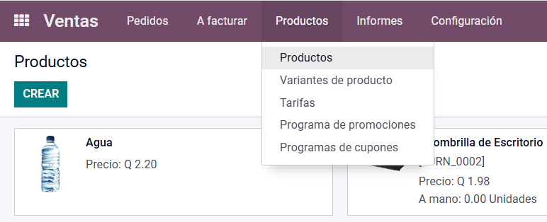 Para agregar un producto, dentro de la aplicación de ventas, ingresamos a Productos, en el menú superior.