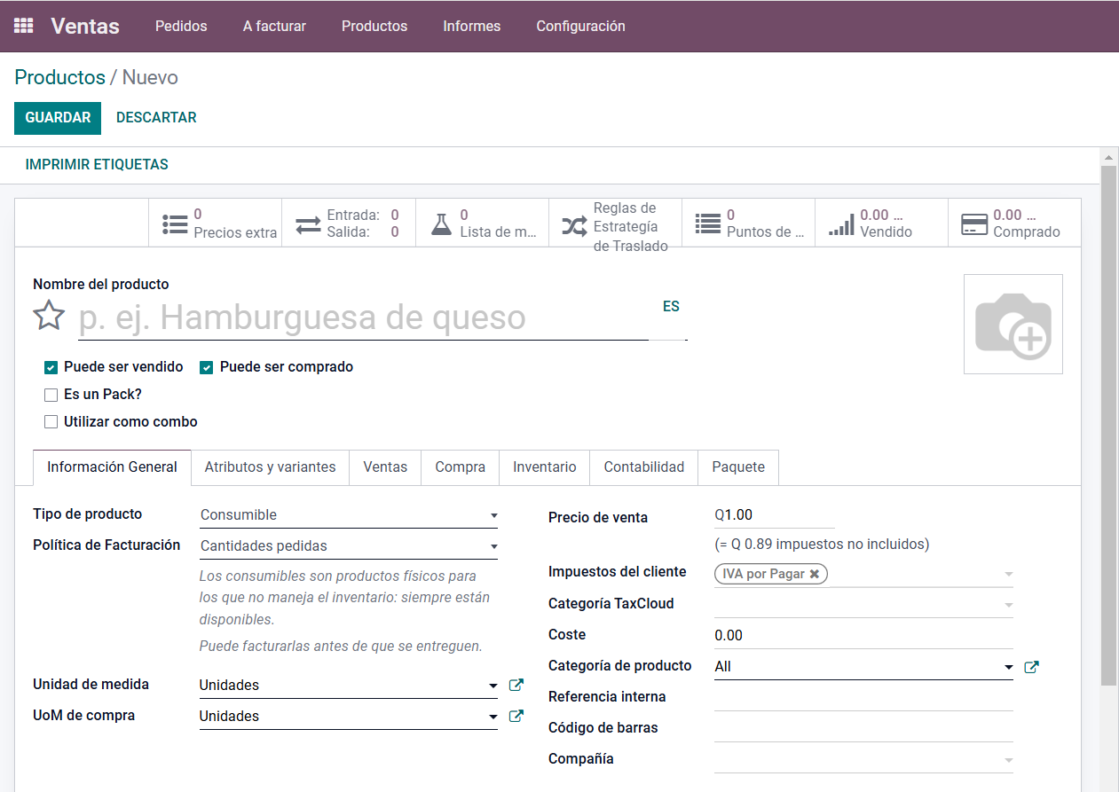 - Consumible: Productos que no gestionas en inventario, pero se desea registrar.