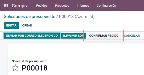 Para confirmar el pedido, se da clic en la opción de Confirmar Pedido. Se genera automáticamente una pedido de compra basada en la información del presupuesto.