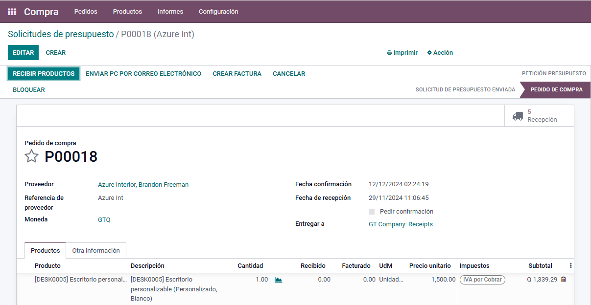 Cuando la solicitud de compra se convierte en pedido de compra, se activan varias opciones para el usuario. Recibir Productos, enviar el pedido de compra por correo electrónico y crear la factura.
