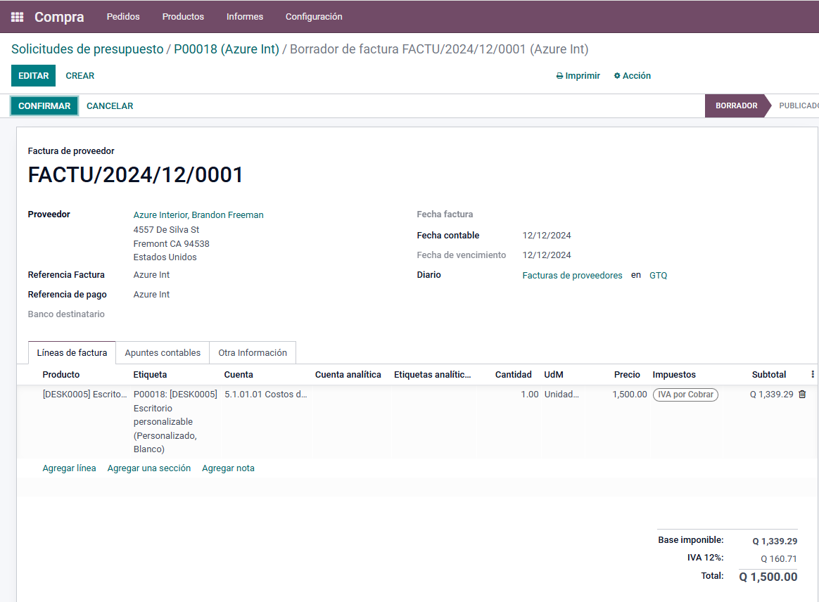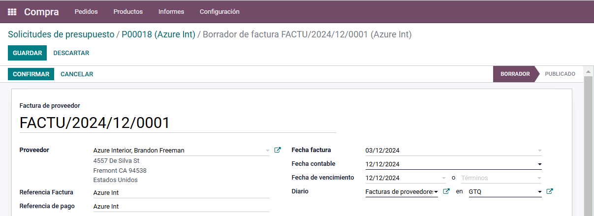 Posteriormente, aparecerá una ventana como la imagen siguiente. La factura se crea en un estado de borrador. Al validar los datos, se procede a Confirmar si los datos se encuentran correctamente.
