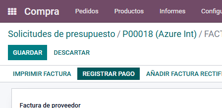 Para crear el pago de la factura, existe una opción dentro de la factura. Esta opción aparece con el nombre de Registrar Pago.