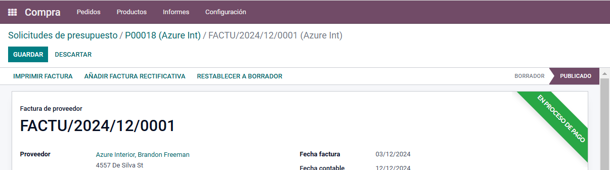 Automáticamente aparecerá una etiqueta de lado derecho donde se indica el estado de la factura. Este estado es En Proceso de Pago.